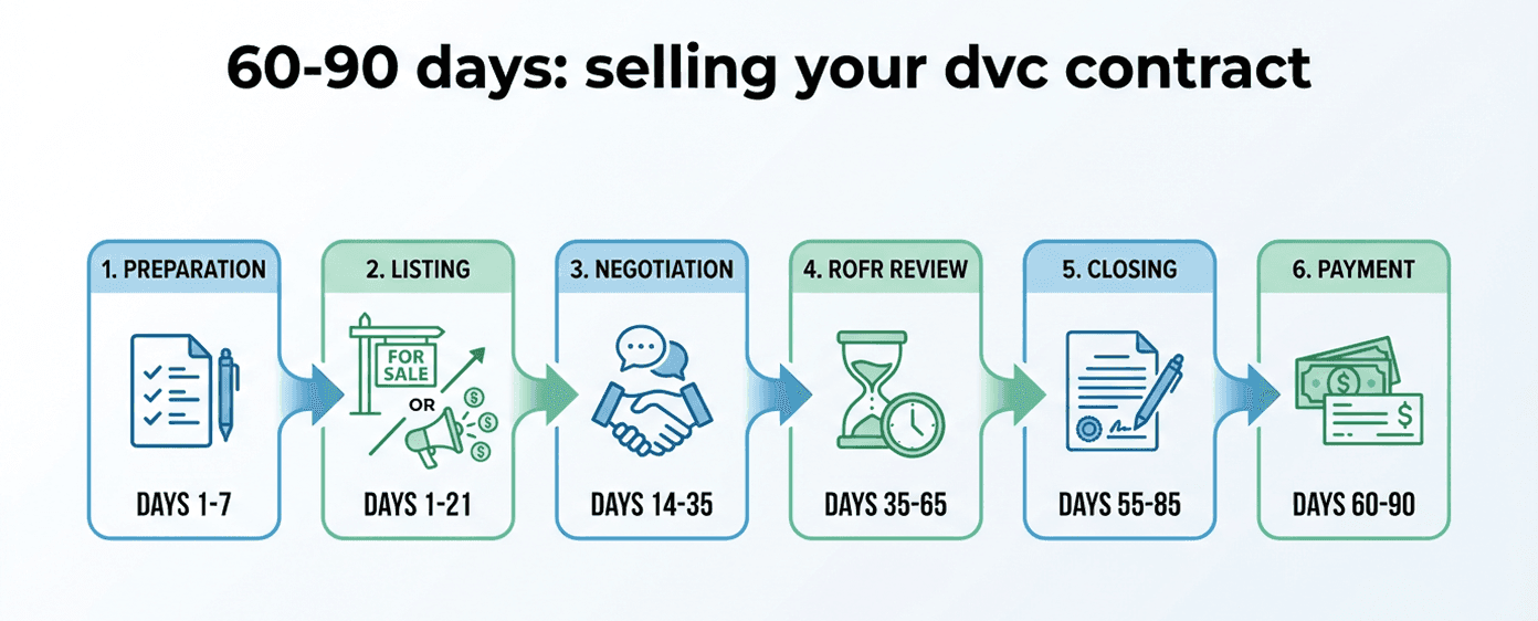 Expect 60-90 days from listing to receiving payment. This includes 2-3 weeks to find a buyer, 30 days for Disney's ROFR review, and 2-4 weeks for closing paperwork.